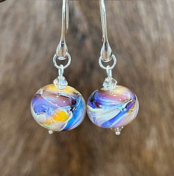 Necklace on 5m black leather with 3 dropped beads of cream, metallic blue and silver